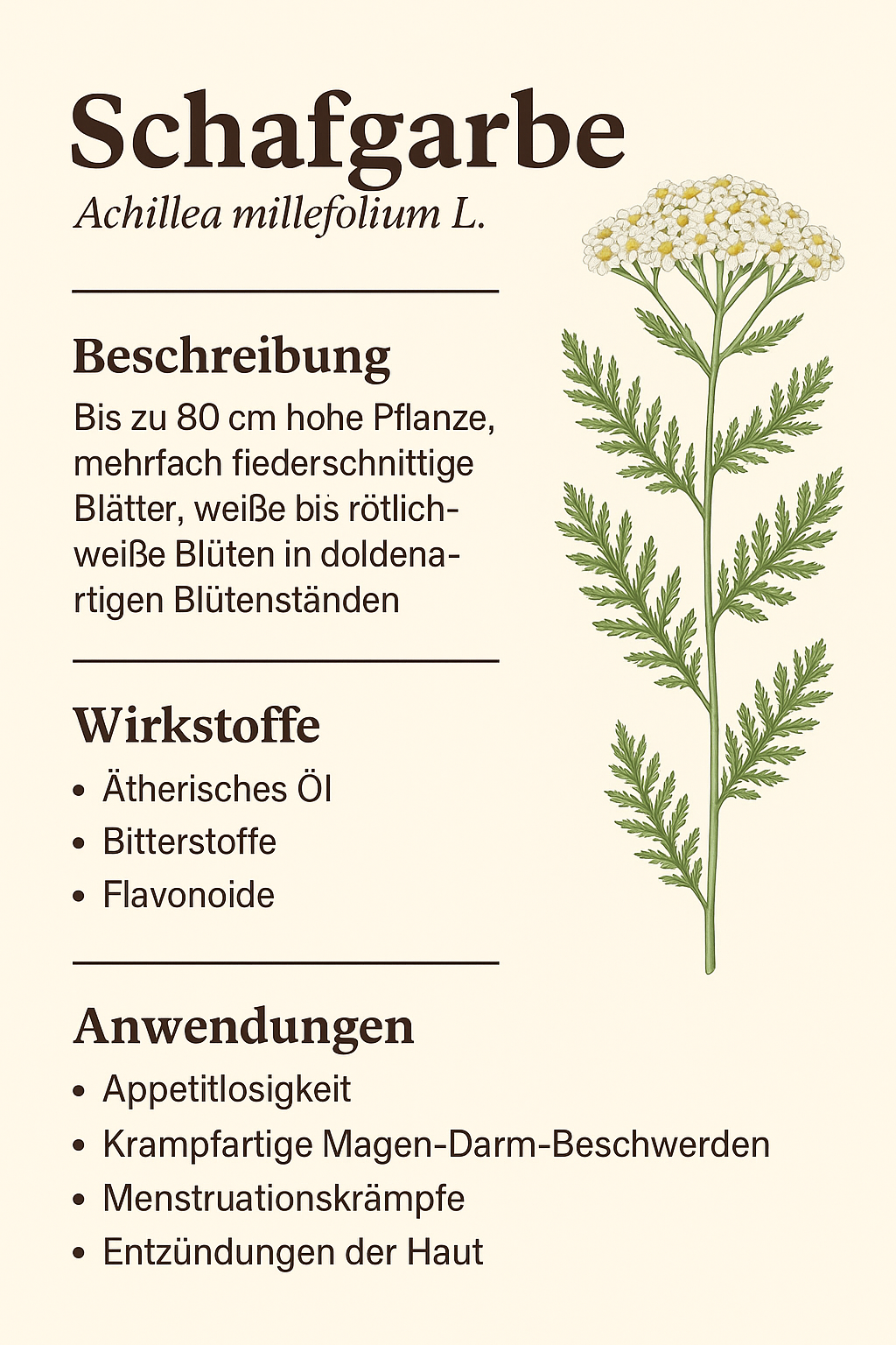 Die Schafgarbe ist eine traditionsreiche und gleichzeitig moderne Heilpflanze mit breitem Wirkspektrum. Gerade in der Beratung zu Verdauung, Appetit, Frauengesundheit und Hautproblemen kann sie eine natürliche und wissenschaftlich abgesicherte Ergänzung sein.